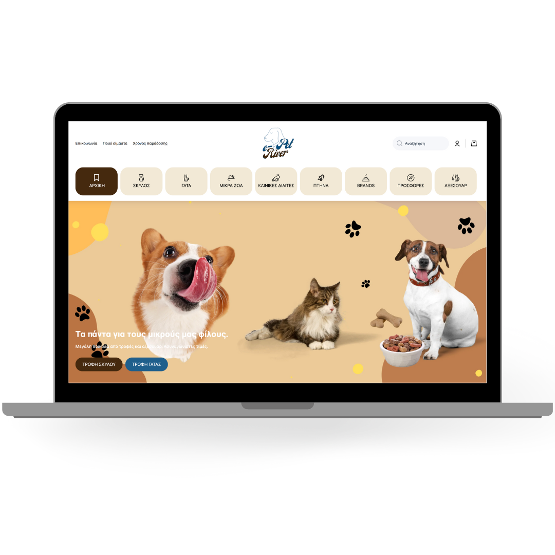 Ο πελάτης Φραγκλίνος Μ. προσδοκούσε την δημιουργία ενός ηλεκτρονικού pet shop με απεριόριστες λειτουργίες, εύχρηστου όμως για τον χρήστη. Προκειμένου η κατηγοριοποίηση των πολυάριθμων προϊόντων να φαίνεται "παιχνίδι" τόσο για τον ιδιοκτήτη του όσο και για τον καταναλωτή, κατασκευάσαμε ένα δυναμικό μενού με mega menu σε κάθε κατηγορία του. [Custom Design]